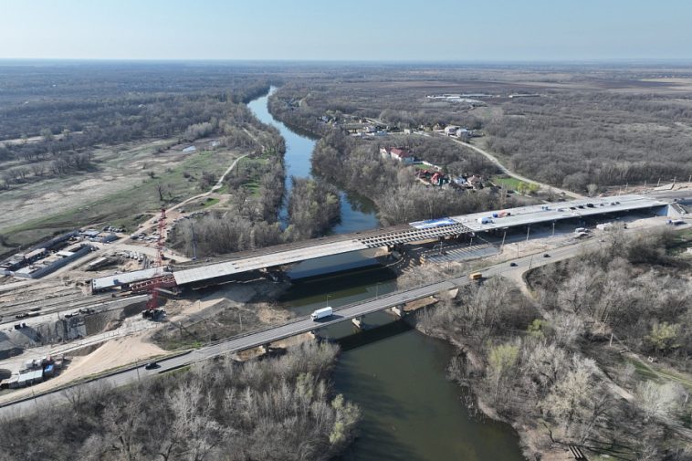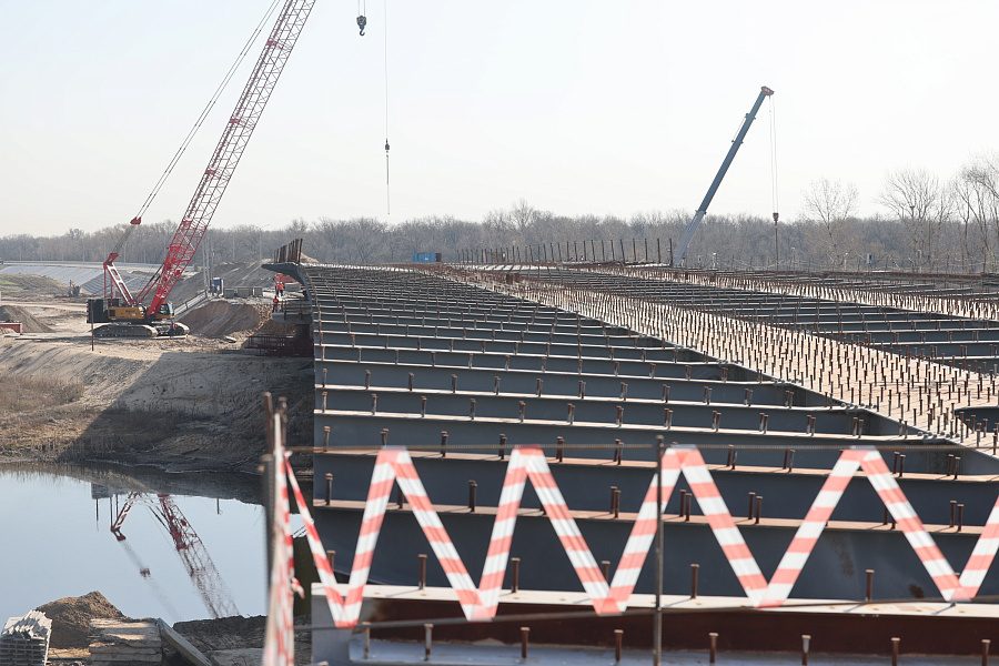 В целом на объекте завершают устройство фундаментов и ростверков, откосы укрепляют монолитным бетоном, георешёткой с щебнем, габионами. Продолжается устройство барьерного ограждения, линий наружного освещения, шумозащитных экранов. Чтобы защитить ерик и пойму от стоков, на объекте предусмотрены локальные очистные сооружения и ливневая канализация.