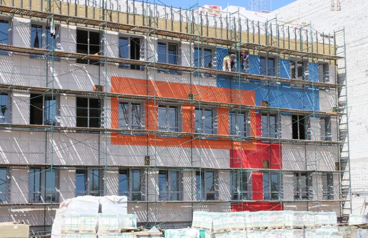 Помимо этого, рабочие занимаются устройством наплавляемой кровли, утеплением фасада здания листами минеральной ваты, а также остеклением будущего общеобразовательного учреждения. Внутри здания строители заливают стяжку полов, возводят перегородки из пазогребневых плит, а также прокладывают инженерные сети.