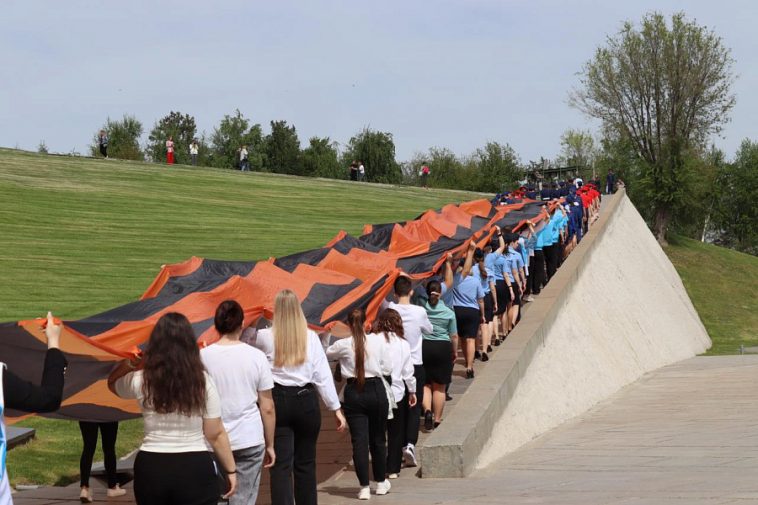 Сегодня, 24 апреля, на главной высоте России – Мамаевом кургане – дан старт всероссийской акции «Георгиевская лента». 80 волгоградских студентов, кадетов, юнармейцев, активистов движения «Волонтёры Победы» пронесли 80-метровую георгиевскую ленту от подножья Мамаева кургана до Зала Воинской Славы. Участники акции почтили память погибших в годы Великой Отечественной войны, возложив цветы к Вечному огню.