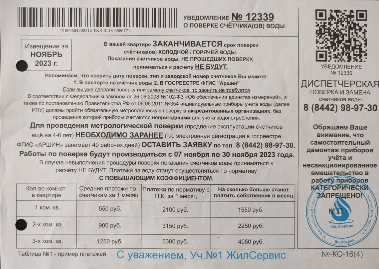В течение последних недель десятки волгоградцев обнаружили в своих почтовых ящиках извещения о срочной поверке индивидуальных приборов учёта. Грозные надписи «ПОВТОРНО!» и «Предписание согласно № 102-ФЗ», а также «страшилки», что в случае отказа от поверки горожанам грозят космические счета за ресурсы, напугали жителей Волгограда.