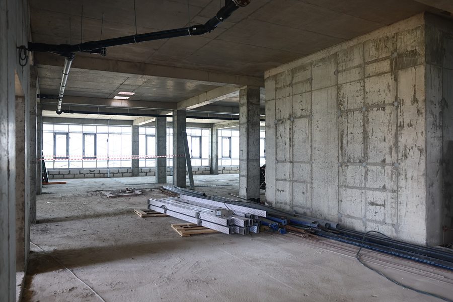Также специалисты заняты прокладкой сетей водоснабжения и канализации; обустройством кровли, навесного фасада. Внутри уже ведутся отделочные работы и монтаж инженерных сетей, слаботочных систем.