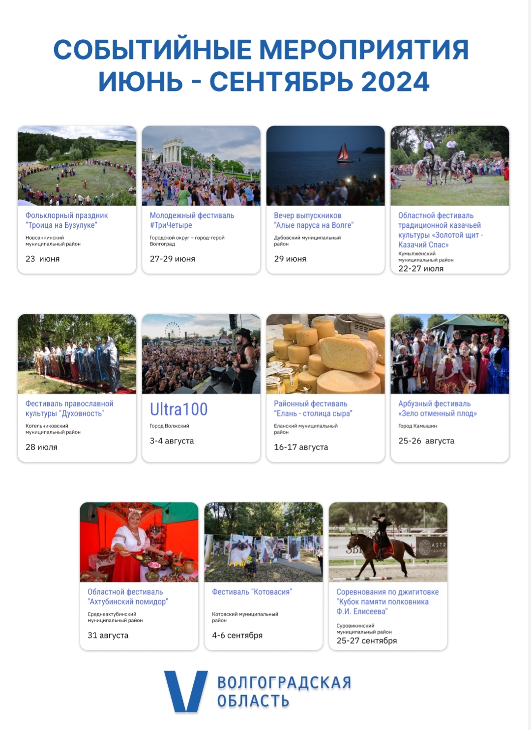 Volganet.net собрал ещё несколько интересных событий, которые стоит посетить. Например, праздник выпускников «Алые паруса на Волге» в Дубовке 29 июня, Волго-Дон фест с круговой дигустацией местных вин (19 и 20 июля), фест креатива и экстрима ULTRA 100 в Волжском (3, 4 августа), а в августе помимо арбузного запланированы сырный (в Елани 16, 17 августа) и помидорный (Среднеахтубинский район в последний день лета).