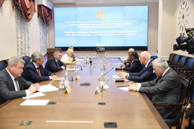Сегодня, 10 июня, губернатор Волгоградской области Андрей Бочаров обсудил с руководством и представителями собственников ОАО «Волжский абразивный завод» вопросы развития предприятия. На встречу с главой региона прибыли председатель совета директоров ОАО, председатель совета директоров CUMI Мутия Муругаппан, гендиректор абразивного завода Сергей Костров.