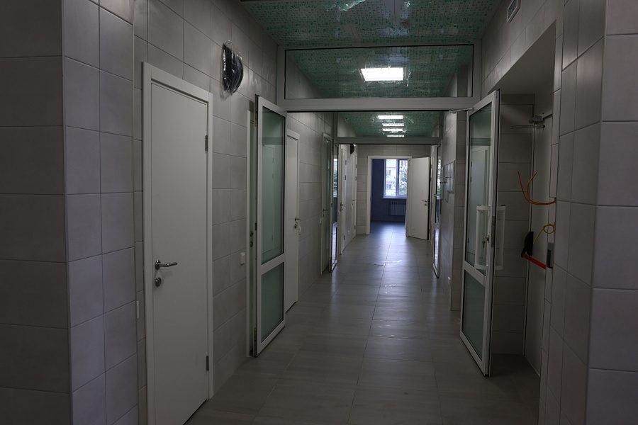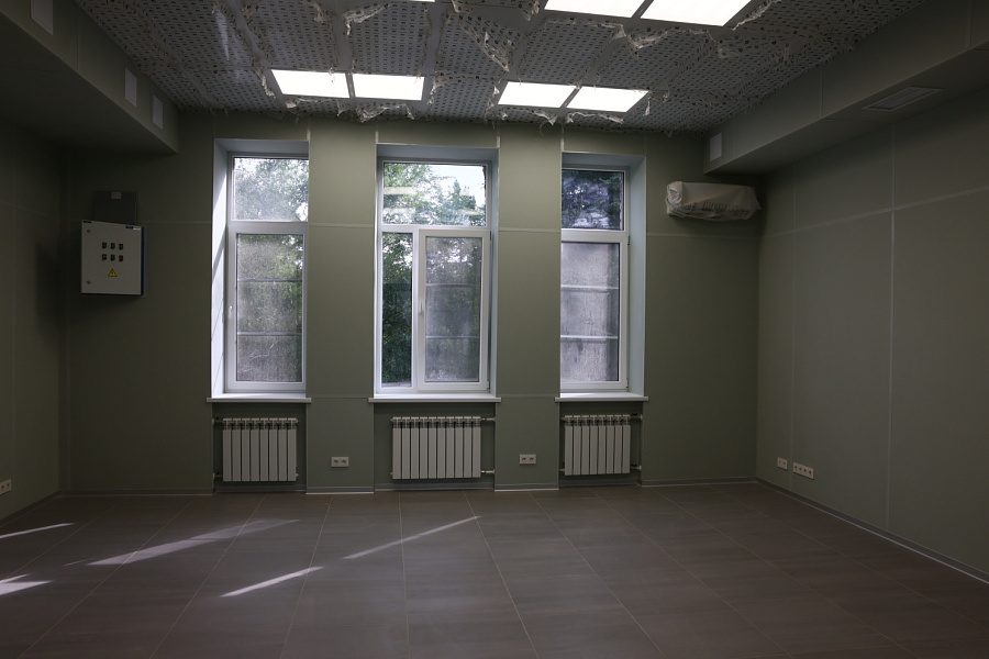 Так, уже на 54% выполнен запланированный объём по обновлению помещений и инженерных систем цокольного, 1-го и 2-го этажей. Здесь будут располагаться регистратура, диагностический блок, дневной стационар на 210 посещений в смену, клинико-диагностическая лаборатория, кабинеты узких специалистов, механотерапия, антропометрия, разнообразные залы для занятий и др.