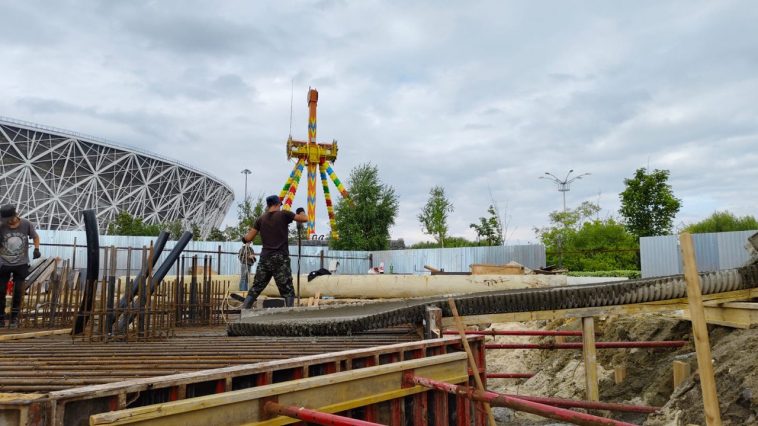 Подрядная организация из Китая приступила к монтажу ещё одного высотного объекта из комплекса экстремальных аттракционов Центрального парка культуры и отдыха. В эти дни рабочие бетонируют платформу, на которой впоследствии будет установлена 50-метровая конструкция «Седьмое небо». По оценке специалистов, для этого потребуется 52 куба бетонной смеси.