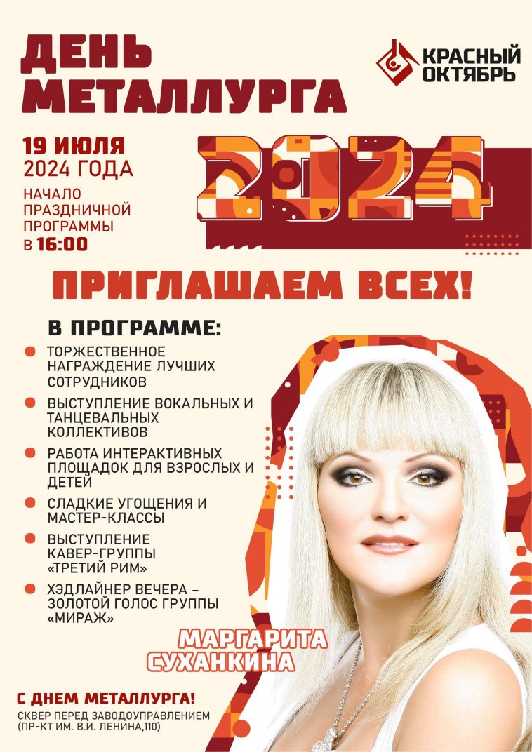Уже завтра, 19 июля в Волгограде стартует празднование Дня металлурга. В сквере у завода «Красный Октябрь» по этому случаю запланировано много активностей. Хедлайнером вечера станет «золотой» голос группы «Мираж» Маргарита Суханкина, сообщили в отделе по связям с общественностью АО «Корпорация Красный октябрь».