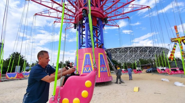 За процессом испытаний также наблюдает представитель специализированной организации, который приехал из Санкт-Петербурга для проведения технического освидетельствования высотного объекта и подтверждения его безопасности. Эксперт уже провёл визуальный осмотр аттракциона, изучил эксплуатационную и техническую документацию, а также произвёл все необходимые замеры.