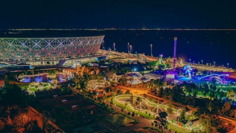 Праздничное освещение есть на территории водных и снежных горок – здесь специалисты смонтировали световые арки и установили Кибер-елку. На катке «Лагуна» в прошедшем сезоне подсвечивался сам лед – вокруг островков была уложена пиксельная подсветка, которая сияла под покрытием в разных режимах.