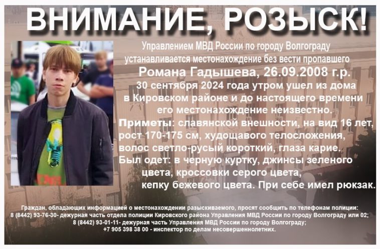 Розыскную ориентировку распространило Управлением МВД России по городу Волгограду. Спустя лишь несколько дней после своего 16-летия в Кировском районе пропал Роман Гадышев.