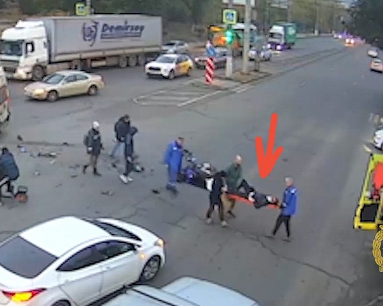 Его, по всей видимости, с тяжёлым травмами на носилках сначала донесли до скорой, а затем доставили в больницу