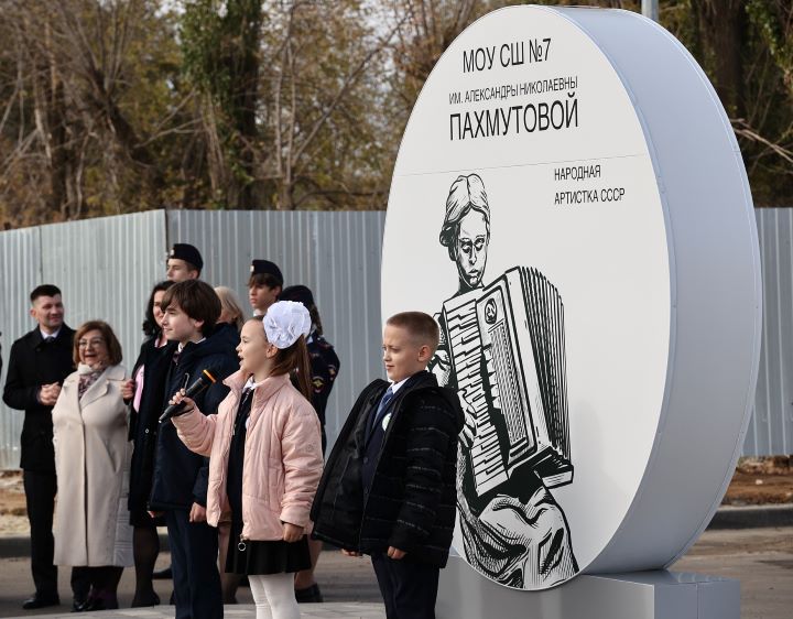 Перед главным входом в школу-тысячник №7 в Дзержинском районе Волгограда появилась стела с изображением девочки с аккордеоном.