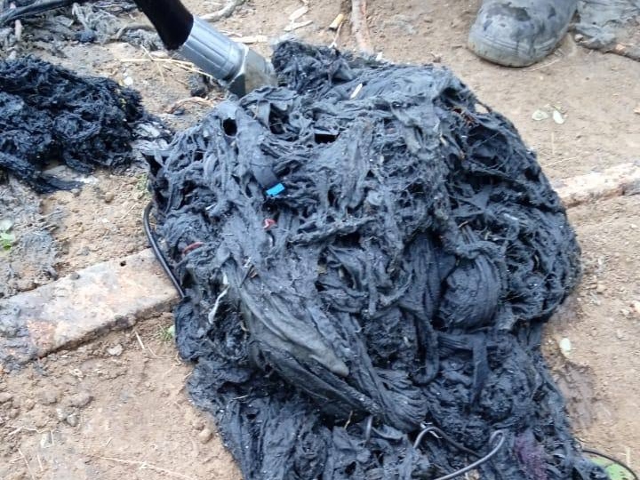 Двое суток коммунальщики прочищают от сильнейшего засора трубопровод коллектора в Тракторозаводском районе. Как сообщили в пресс-службе компании, на этом работа не окончена, но уже удалось извлечь из трубы 2 фрагмента мусорной пробки из тряпок, влажных салфеток и др. Вес пробки около 10 кг!