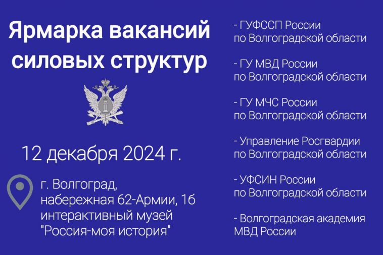 12 декабря в областном центре состоится ярмарка вакансий силовых структур. Её организует служба судебных приставов, однако, консультации по трудоустройству на ярмарке можно получить не только в это ведомство, а также в региональные управления ФСИН и Росгвардии, главные управления МВД и МЧС России по Волгоградской области.