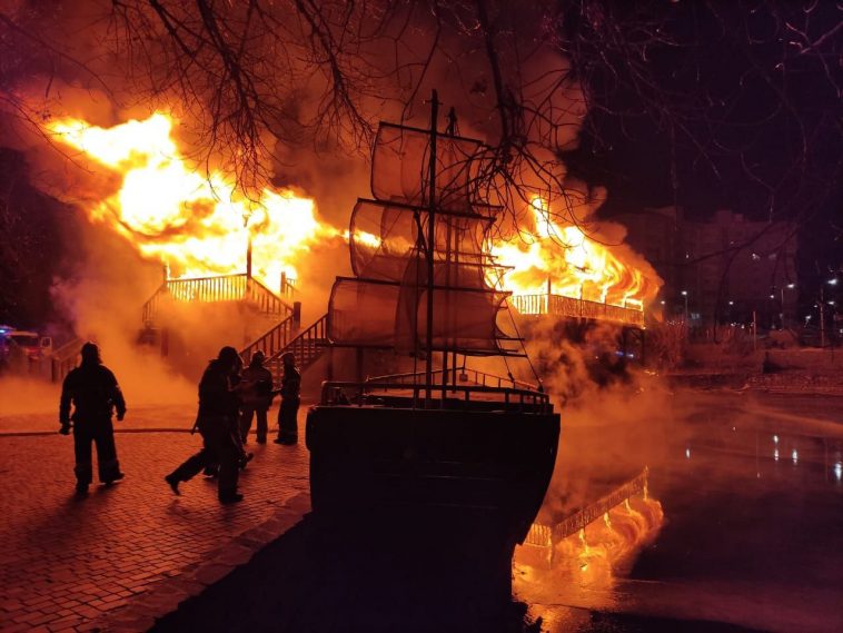 Здание на улице Качинцев, 79 сгорело практически полностью. Это ресторан «Родничок», довольно долго принимавший гостей и славившийся своими мясными блюдами.