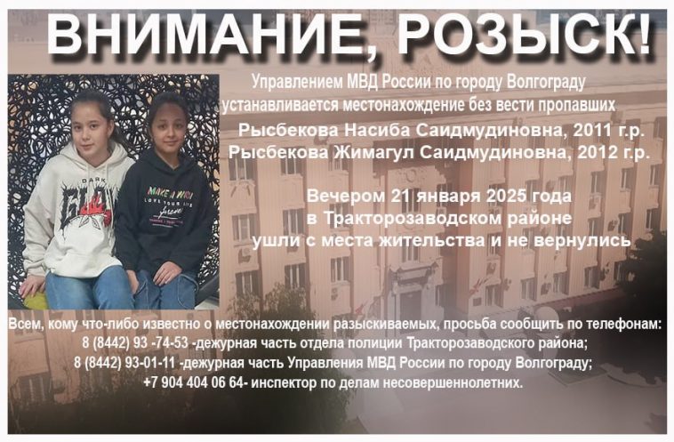 Полиция опубликовала ориентировку на розыск двух несовершеннолетних девочек. Это сёстры Рысбековы — Насиба 2011 года рождения и Жимагул 2012.