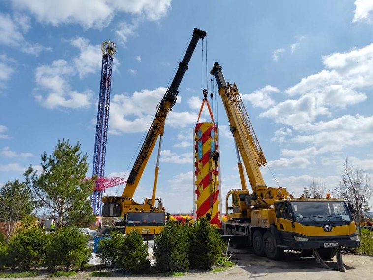 Конструкцию такой массы монтируют с помощью строительных кранов высокой грузоподъемности. А для установки верхних элементов аттракциона будут использовать кран с вылетом стрелы около 70 метров. Для безопасности посетителей, площадка, где работает тяжелая техника, сейчас огорожена.