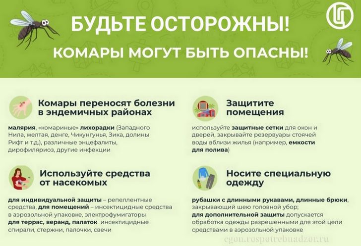 При посещении парков и скверов следует надевать закрытую одежду. Желательно не создавать во дворе частного дома или на даче ландшафтные объекты со стоячей водой. Также важно избегать заболоченных мест.