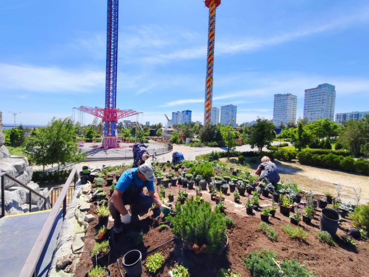 Аналогичные работы по обустройству «висячего» сада сейчас проводятся на крыше возле второго экстрим-аттракциона «Мельница». Служба благоустройства помимо гидроизоляции дополнительно уложила георешетку, с учетом уклона крыши это позволит удерживать грунт от сползания. Высадка цветов и растений здесь стартует уже в начале лета.