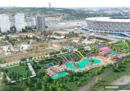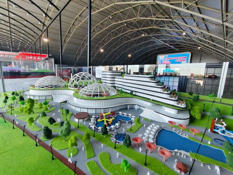 Площадь второго макета достигает четырех с половиной метров. Это будущий аквапарк. Он станет крупнейшим водным объектом в Поволжье и будет вмещать в себя следующие зоны: открытый с 4 горками и 4 бассейнами и крытый аквапарки, тропическую зону и СПА, гостиницу, зоны питания и паркинг. Крытый разместится в трех куполах, в том числе с организацией спа-пространства, игровых площадок и так далее.