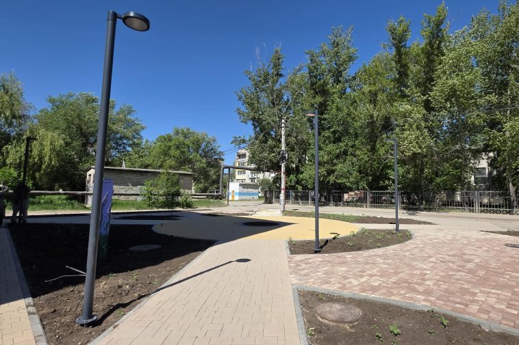 Подрядчики установили бордюрный камень, смонтировали системы видеонаблюдения и освещения, обустроили тротуарное покрытие. Позднее специалисты обустроят авто- и велопарковки, зону отдыха с перголой, высадят деревья и кустарники, установят парковую мебель, светящиеся качели. Современное пешеходное пространство будет готово к концу сентября.