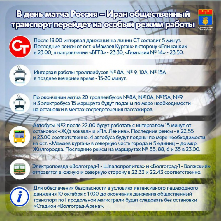 Для болельщиков, которые приедут на своих машинах, организуют парковки рядом со стадионом «Волгоград Арена». Основные стоянки находятся на улице 7-й Гвардейской, у Областного суда, Волгоградской академии физической культуры (со стороны улицы Крылова), Дворца спорта и торгового центра «Стройград».