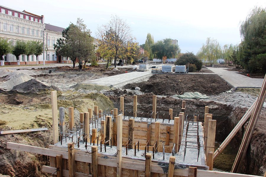 В Суровикино подрядчики построили и залили фундамент мемориала. Сейчас поэтапно заливают тело стелы. В сквере рядом подготовили и залили основания для фонтана.