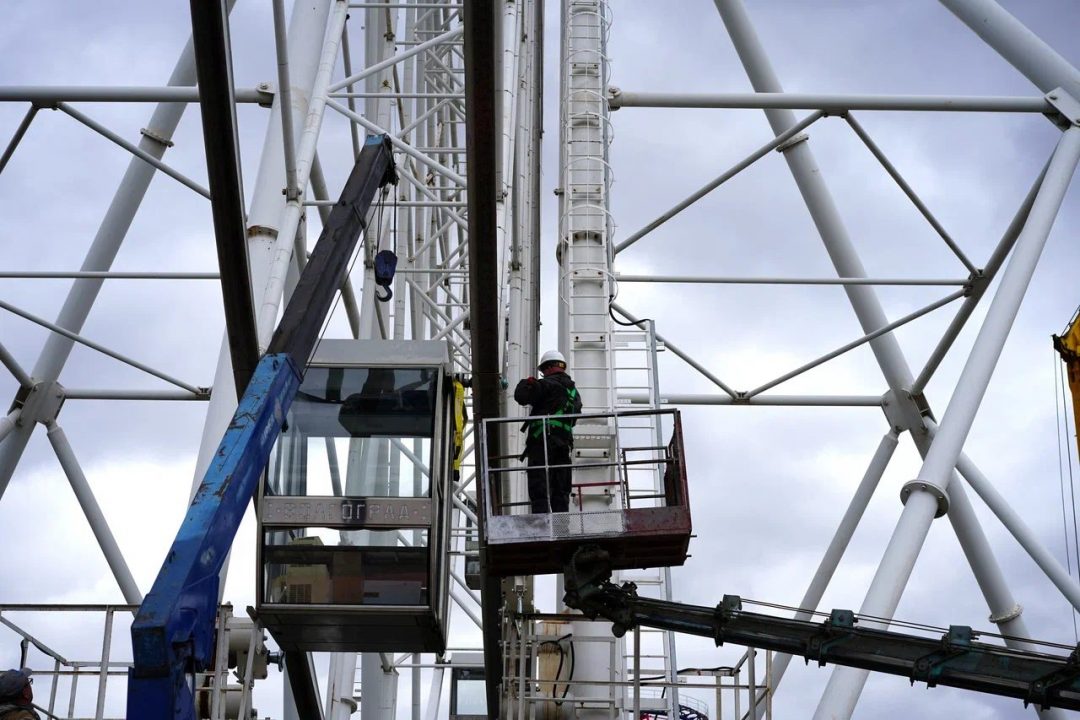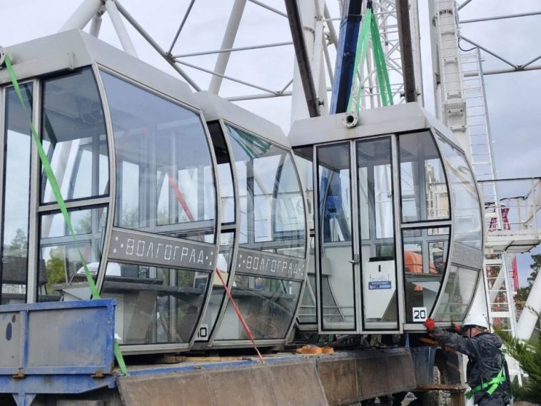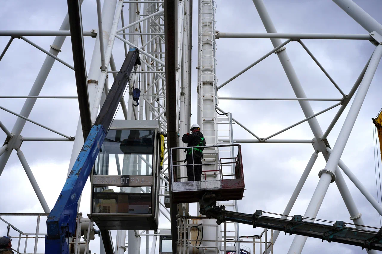 Рабочие снимают пассажирские кабинки с колеса обозрения в волгоградском ЦПКиО. Всего демонтируют 20 модулей, каждый из них весит около 250 килограммов. Для демонтажа аттракциона используется спецтехника: кран до 5 тонн и две вышки. Компания-подрядчик начнет с кабин, затем перейдет к стрелам и центральной опоре. Работы планируют завершить до конца ноября.