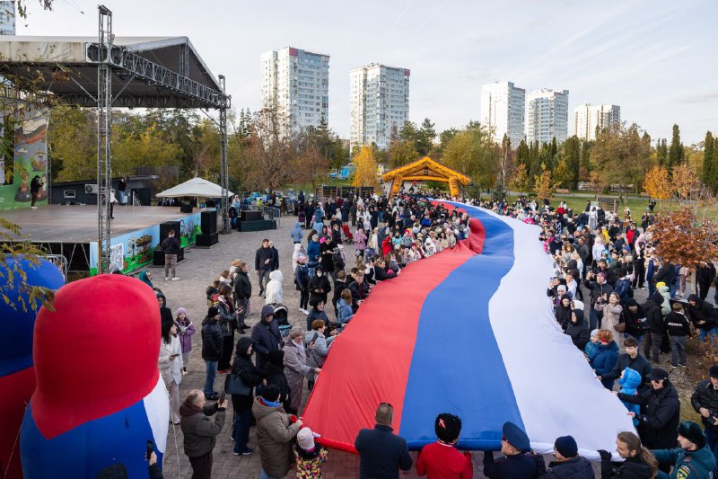 Одним из самых зрелищных моментов праздника стал развернутый по парку 100-метровый российский триколор. Знамя держали сотни волгоградцев.