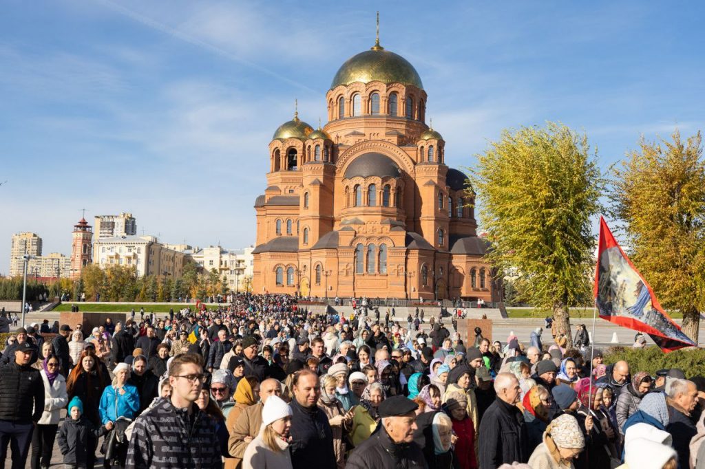 Православные волгоградцы вместе со священнослужителями проследовали от собора к Центральной набережной.