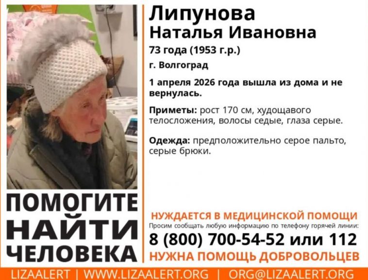 В Волгограде разыскивают 73-летнюю Наталью Ивановну Липунову. Пенсионерка ушла из дома 1 апреля 2026 года и до настоящего времени не вернулась, сообщает поисковый отряд «ЛизаАлерт».
