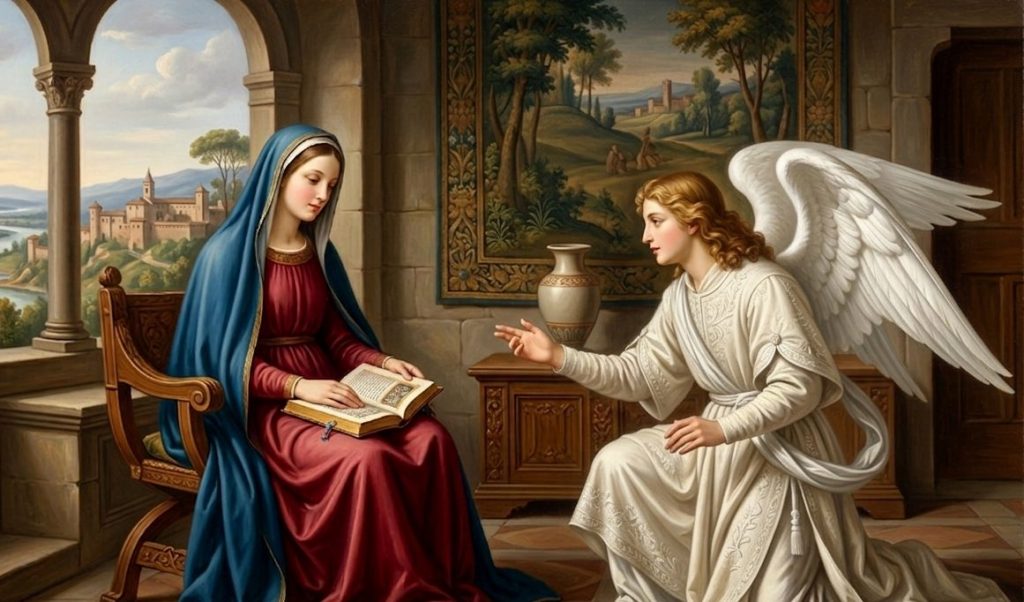 Однажды, когда Мария была дома одна и читала книгу пророка Исайи, где говорилось о грядущем рождении Спасителя, перед ней предстал архангел Гавриил. Он приветствовал ее словами: «Радуйся, Благодатная! Господь с Тобою; благословенна Ты между женами».