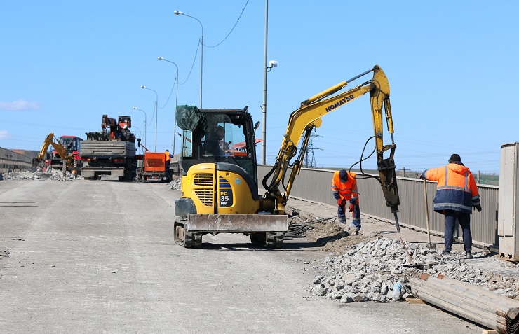 Специалисты работают на участке протяжённостью более 400 метров и шириной 12 метров, а также на двух подходах к путепроводу длиной по 50 метров каждый. С помощью экскаваторов, оборудованных гидромолотами, рабочие демонтируют бетонное основание на фрагменты. Измельчённый строительный материал впоследствии утилизируют.